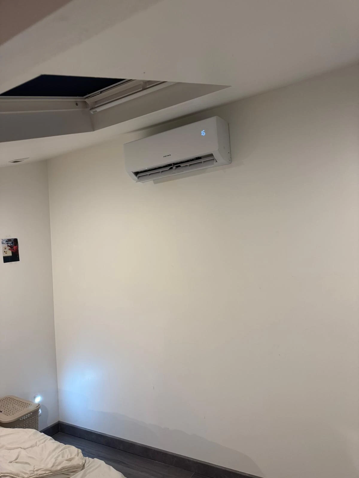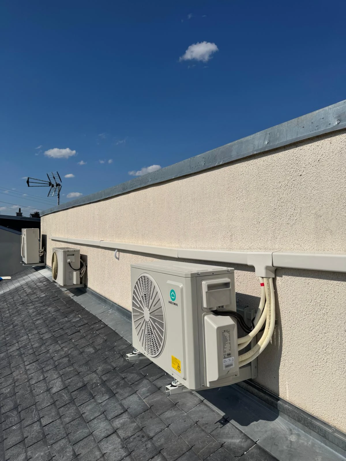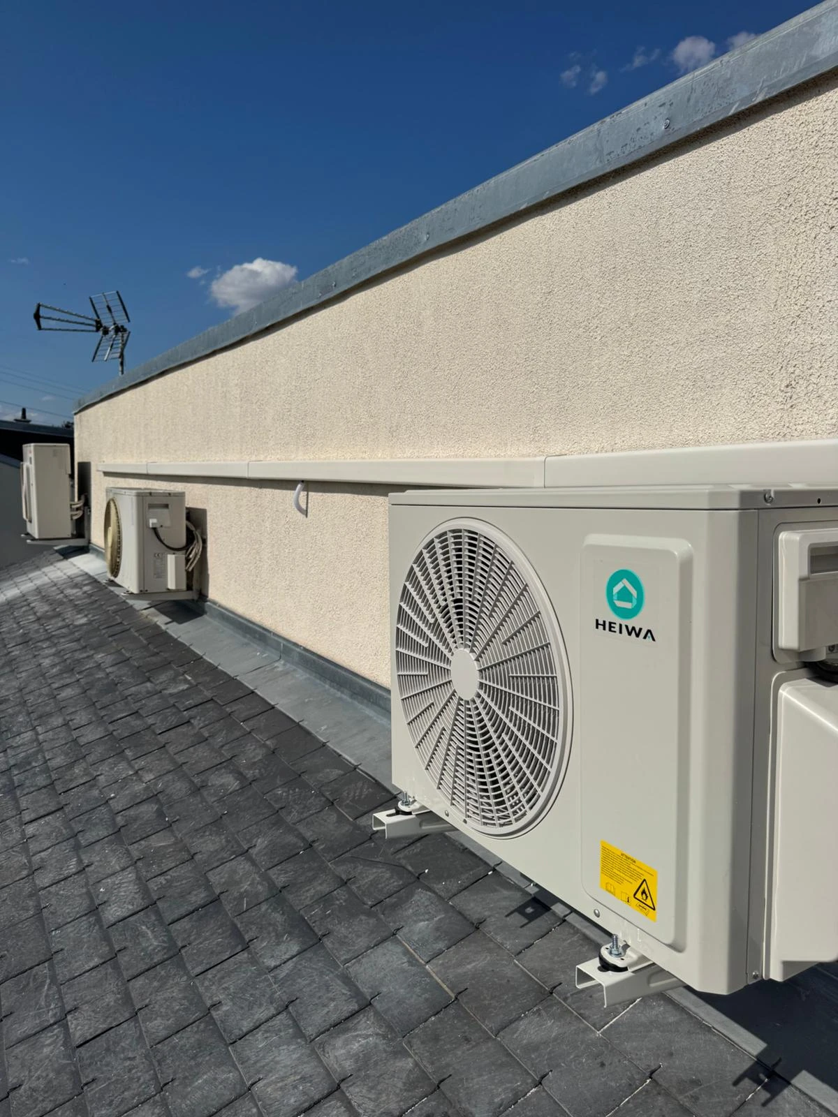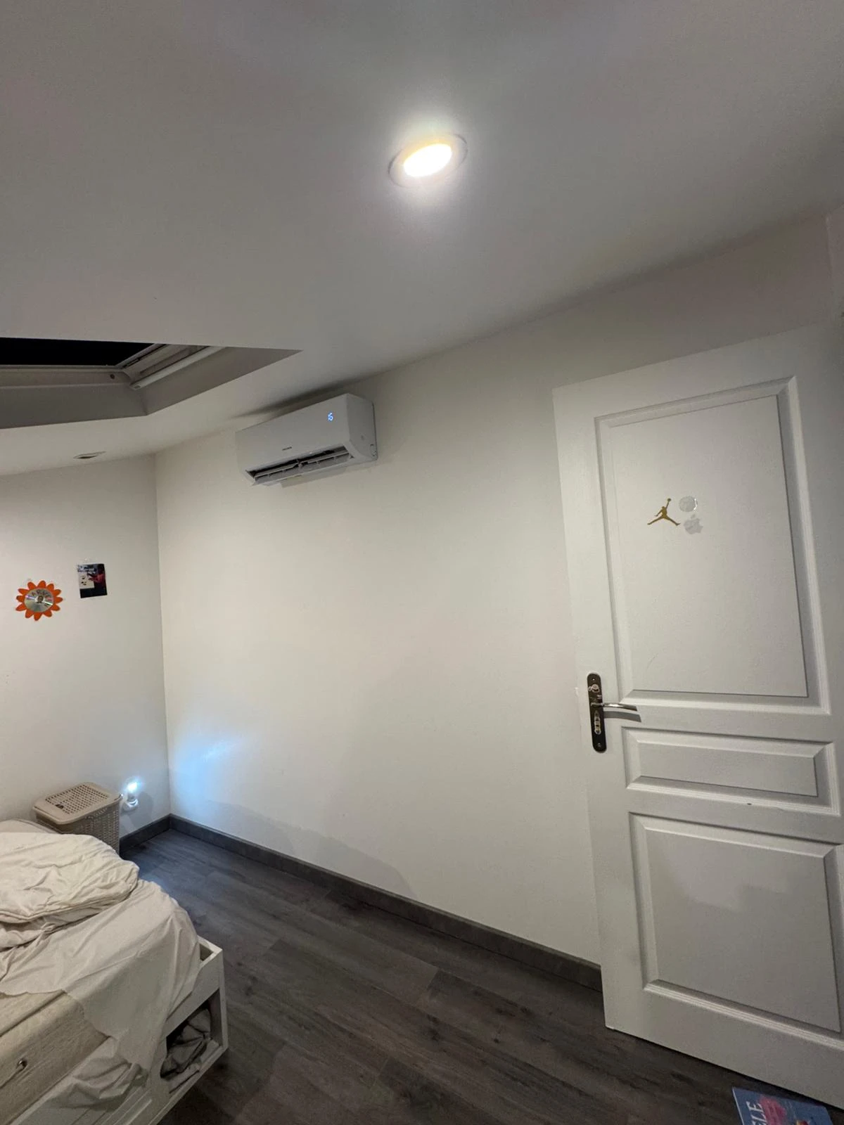Installation d'un système de climatisation réversible dans une maison individuelle. Pose soignée avec passage de gaines encastrées.